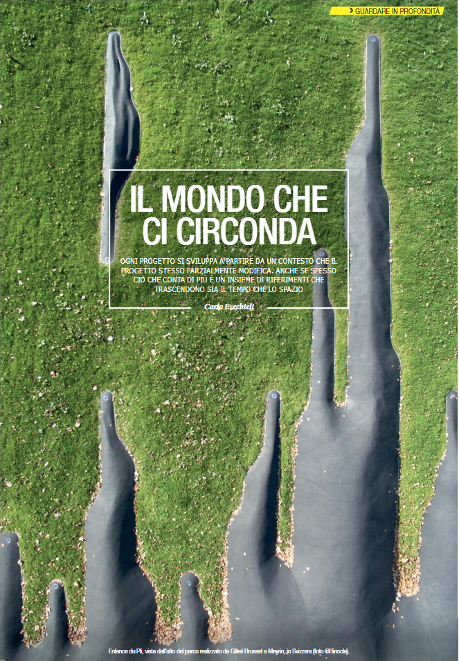 Le fonti di ispirazione di un progetto sono infinite, talvolta vengono in superficie nei modi più inaspettati. Spesso fanno riferimento a immagini del tutto astratte, come nel caso della celeberrima Cappella di Ronchamp Notre ispirata, si dice, dalla forma di una conchiglia. Altre a situazioni e circostanze fisiche o temporali che un luogo ad un primo sguardo rivela difficilmente. Come nelle opere di Gilles Brusset, in questo numero, o alle sculture di Pinuccio Sciola che, attraverso i tagli, sprigionano l’incommensurabile profondità dei milioni di anni delle forze formidabili da cui hanno avuto origine. L’architettura dà forma, rappresenta, propone cose che non esistevano, traduce concetti in materia e spazio. Questi ultimi possono fare riferimento ad elementi fondamentali ma che permeano il contesto in modo così pervasivo da passare quasi inosservati. Parlando di luoghi, molti di questi elementi ne improntano completamente sia la struttura che il funzionamento. Col passare del tempo abbiamo appiattito i luoghi, soprapponendo a questi una sorta di strato tecnologico, che è diventato ormai il nostro unico riferimento. E mentre il nostro sguardo si limita a questo sottilissimo strato superficiale, rischiamo di dimenticare insieme alla nostra identità, la consapevolezza ampia del mondo che ci circonda. Un perdita che sta all’origine dei problemi ambientali di così pressante attualità.