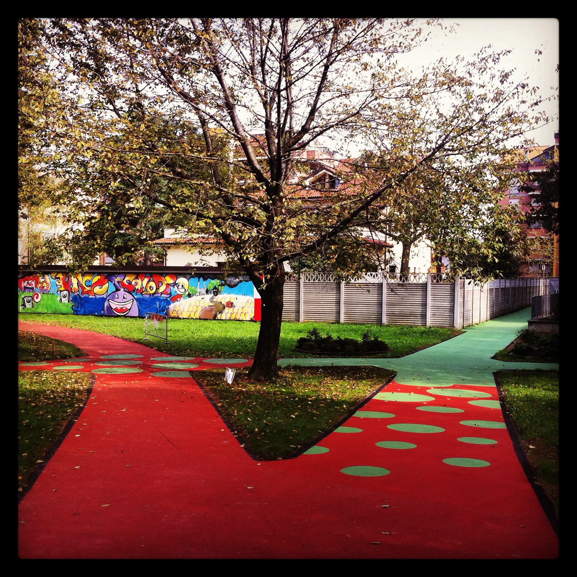 dinamically over the grass lawn, encircling trees, Colors matching with